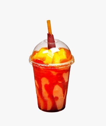 Shaved ice prepared with mango and strawberry syrup, fresh fruit, coconut flakes and covered with condensed milk.