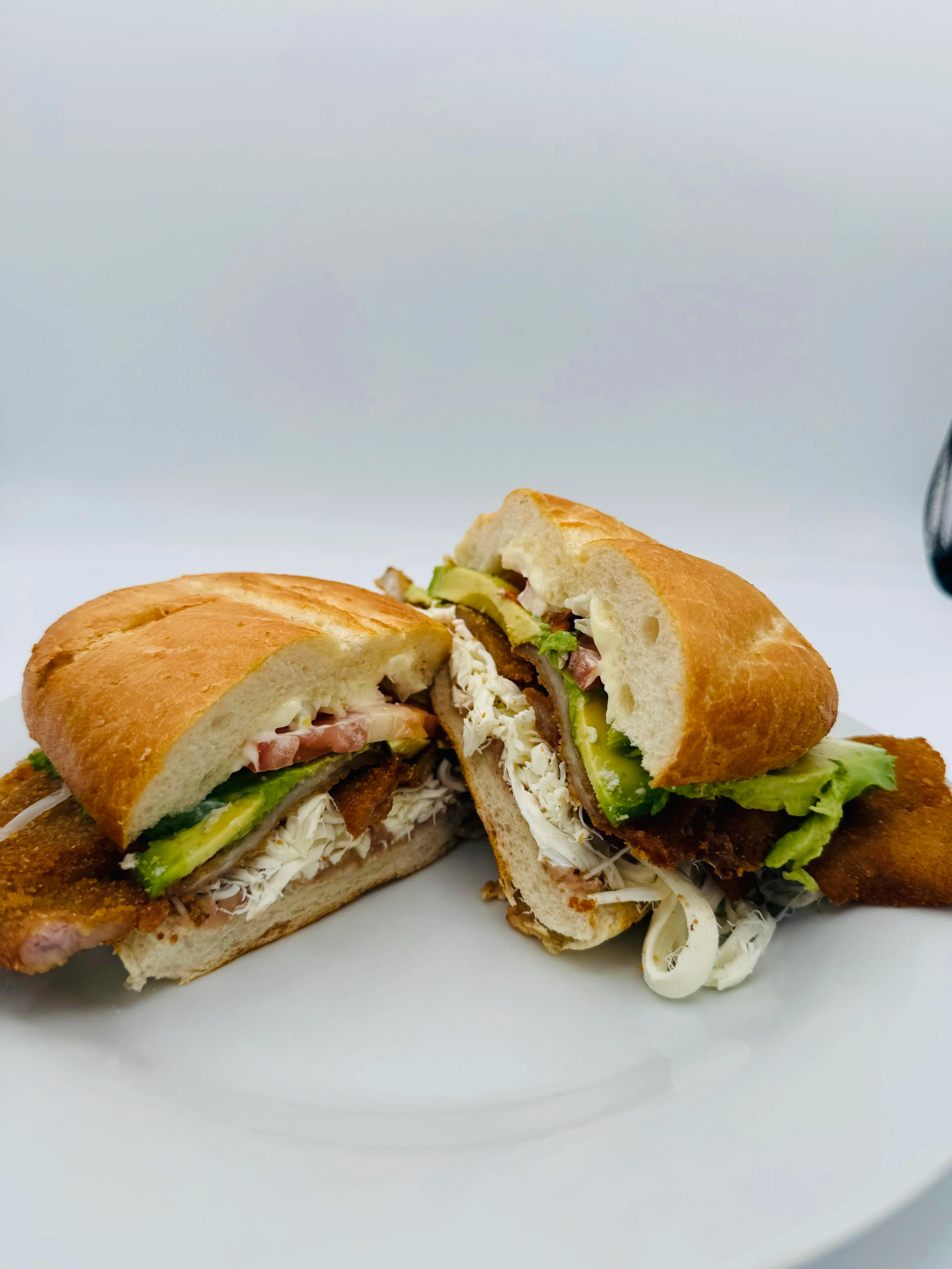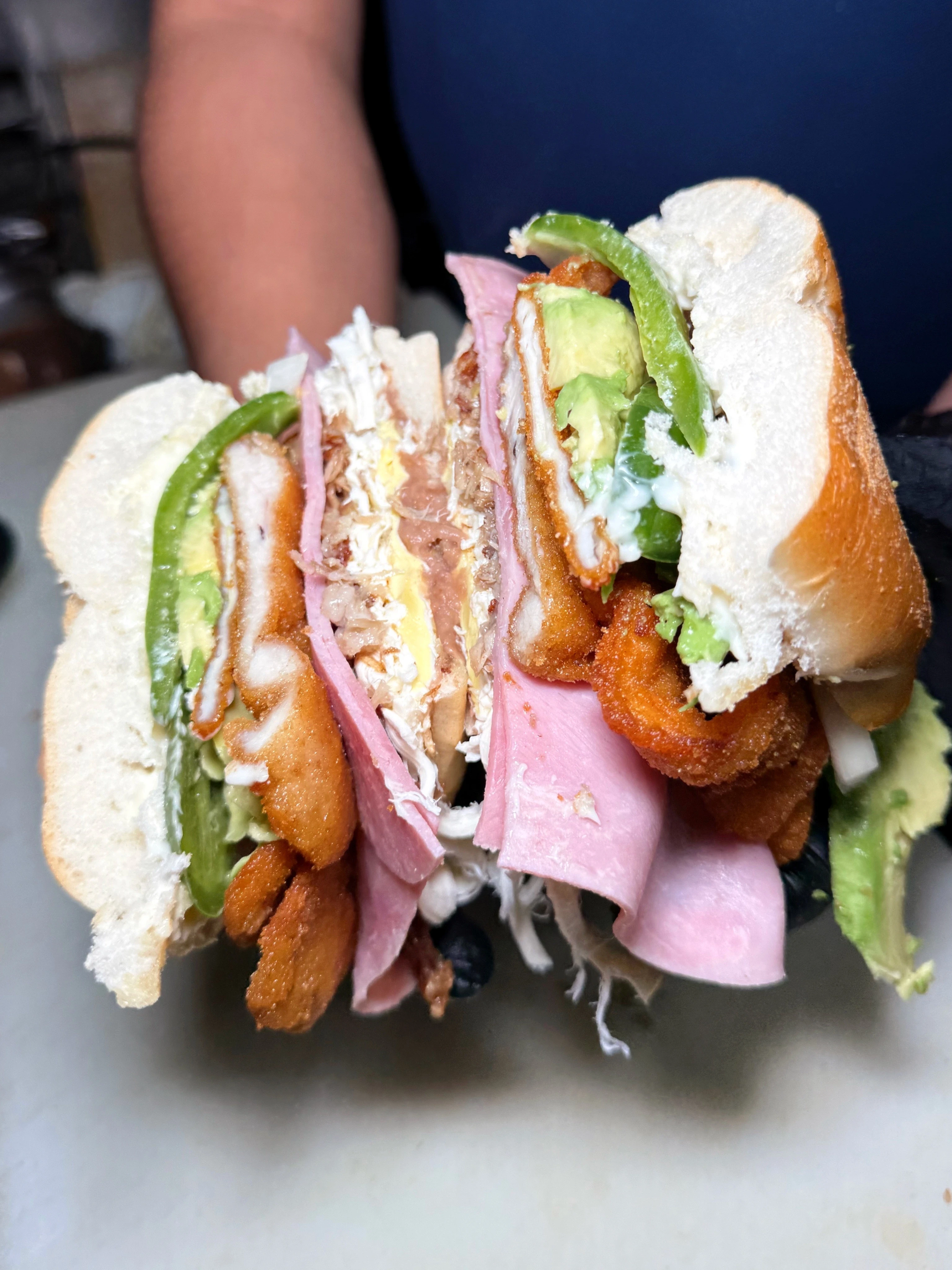 Crispy breaded pork cutlet a Puebla-style sandwich prepared with refried beans, onions, cheese (quesillo) avocado, mayonnaise and rajas or chipotle (optional).