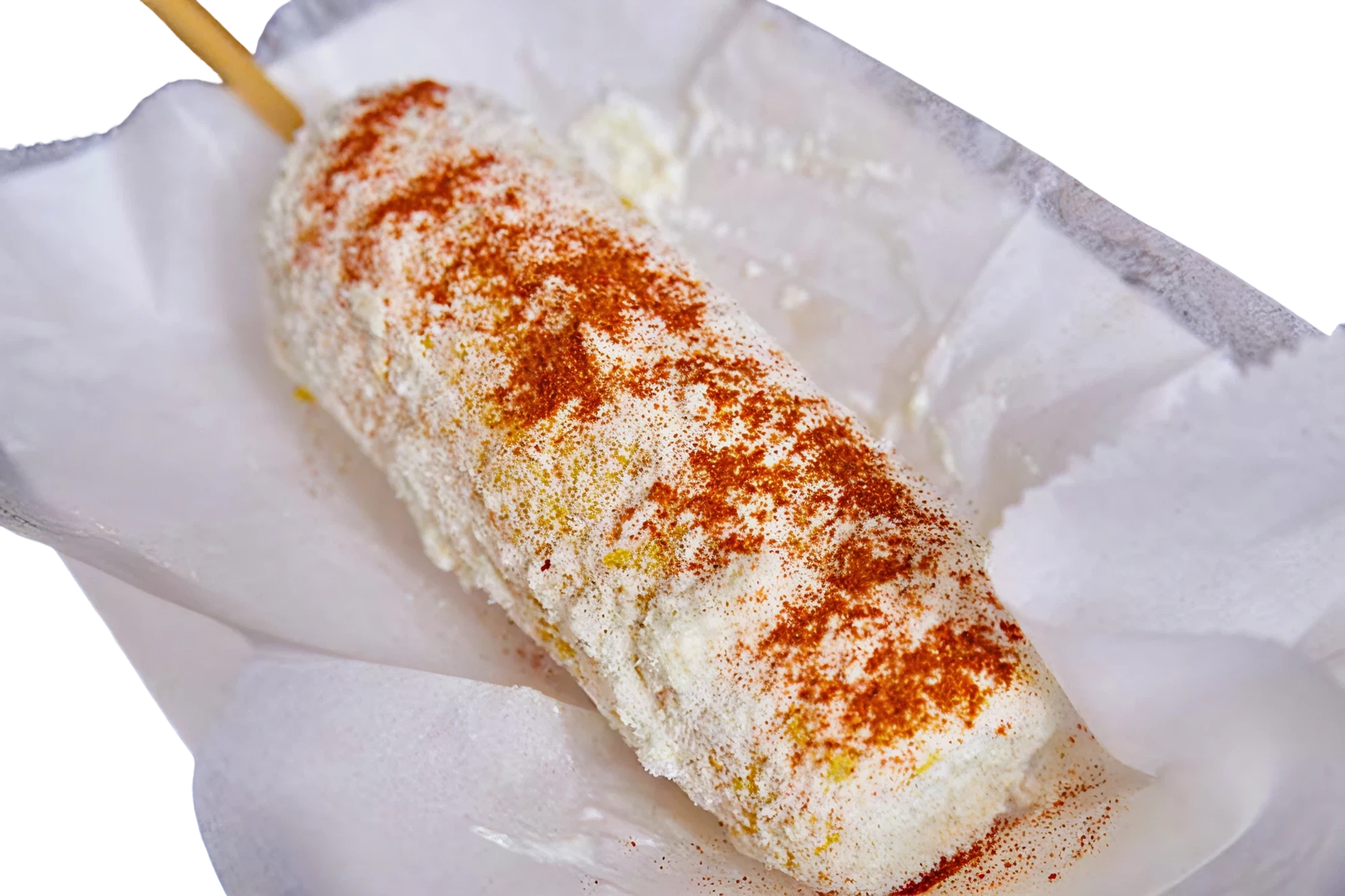 Corn on the cob coated with creamy mayonnaise, sprinkled with cotija cheese, and cayenne pepper powder.