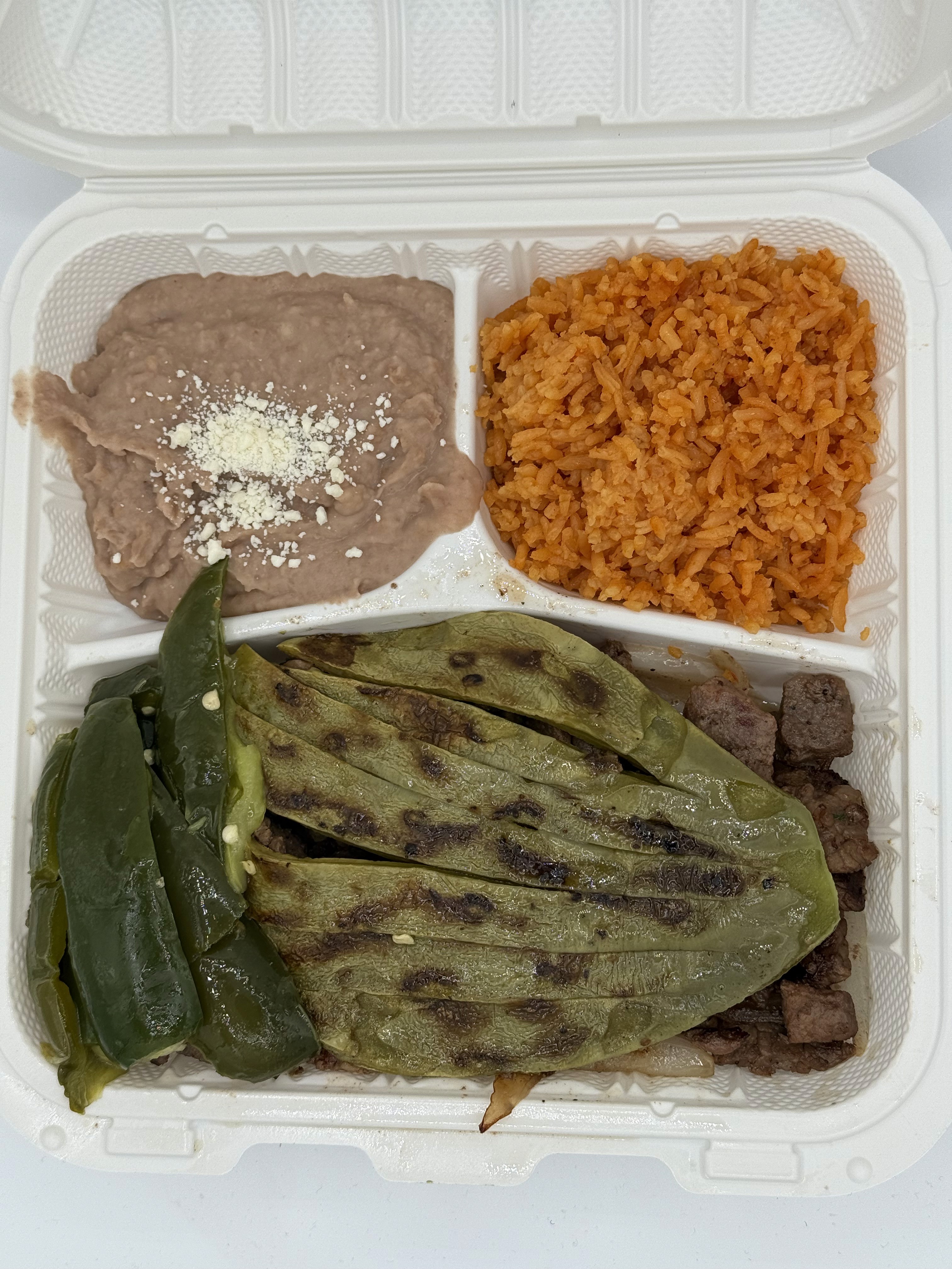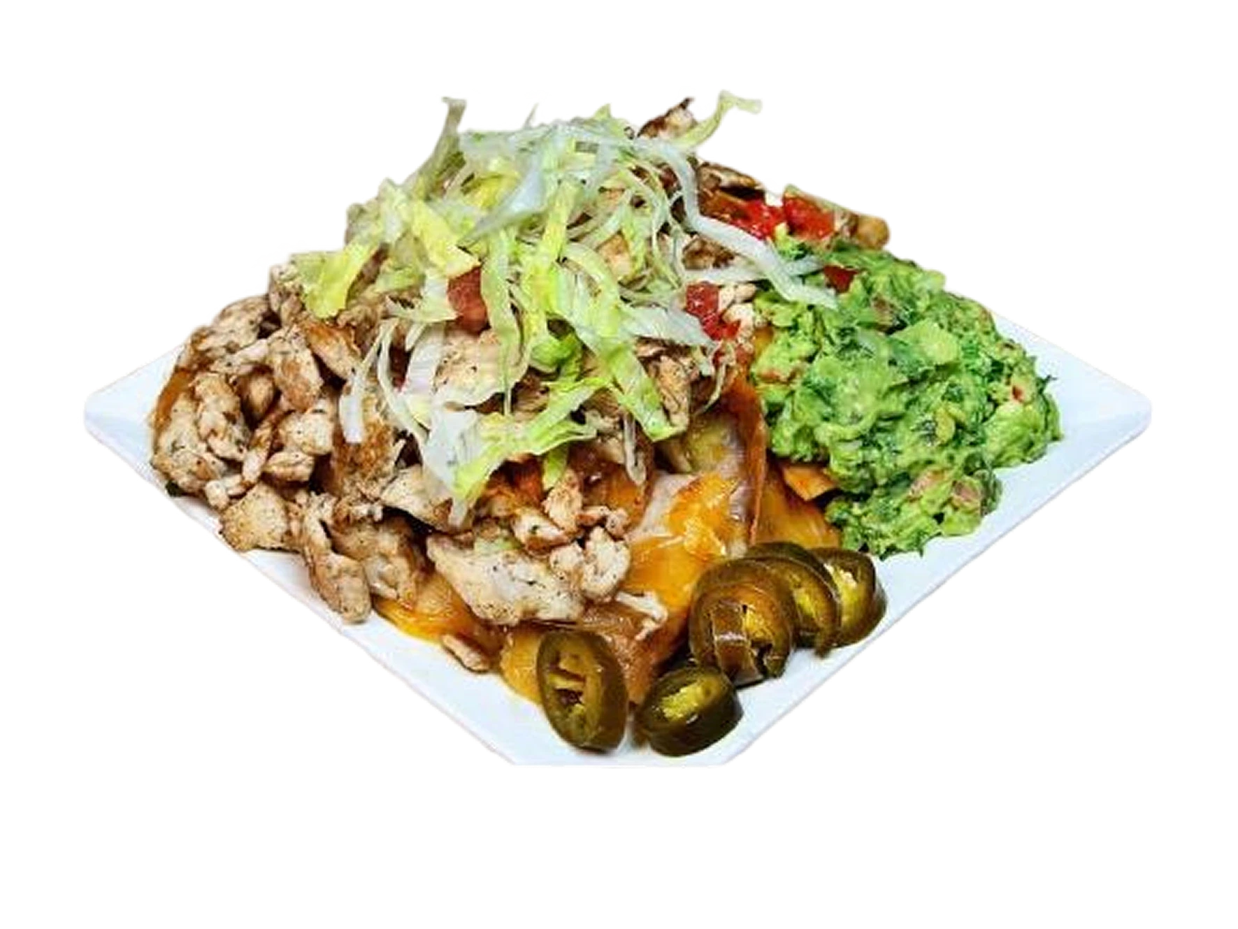 Comes with guacamole, lettuce, tomato, jalapeños, and refried beans.