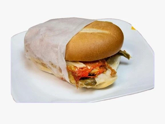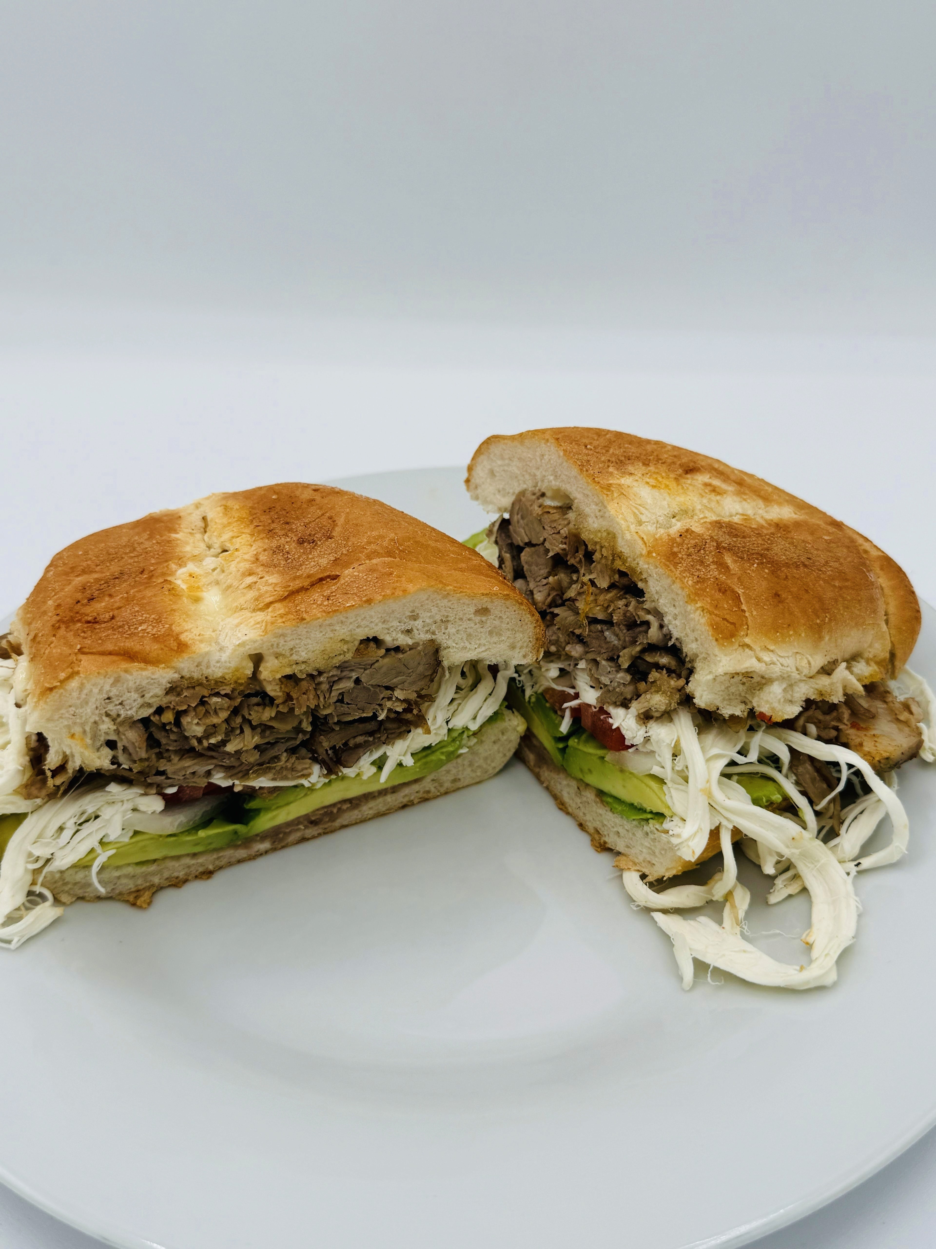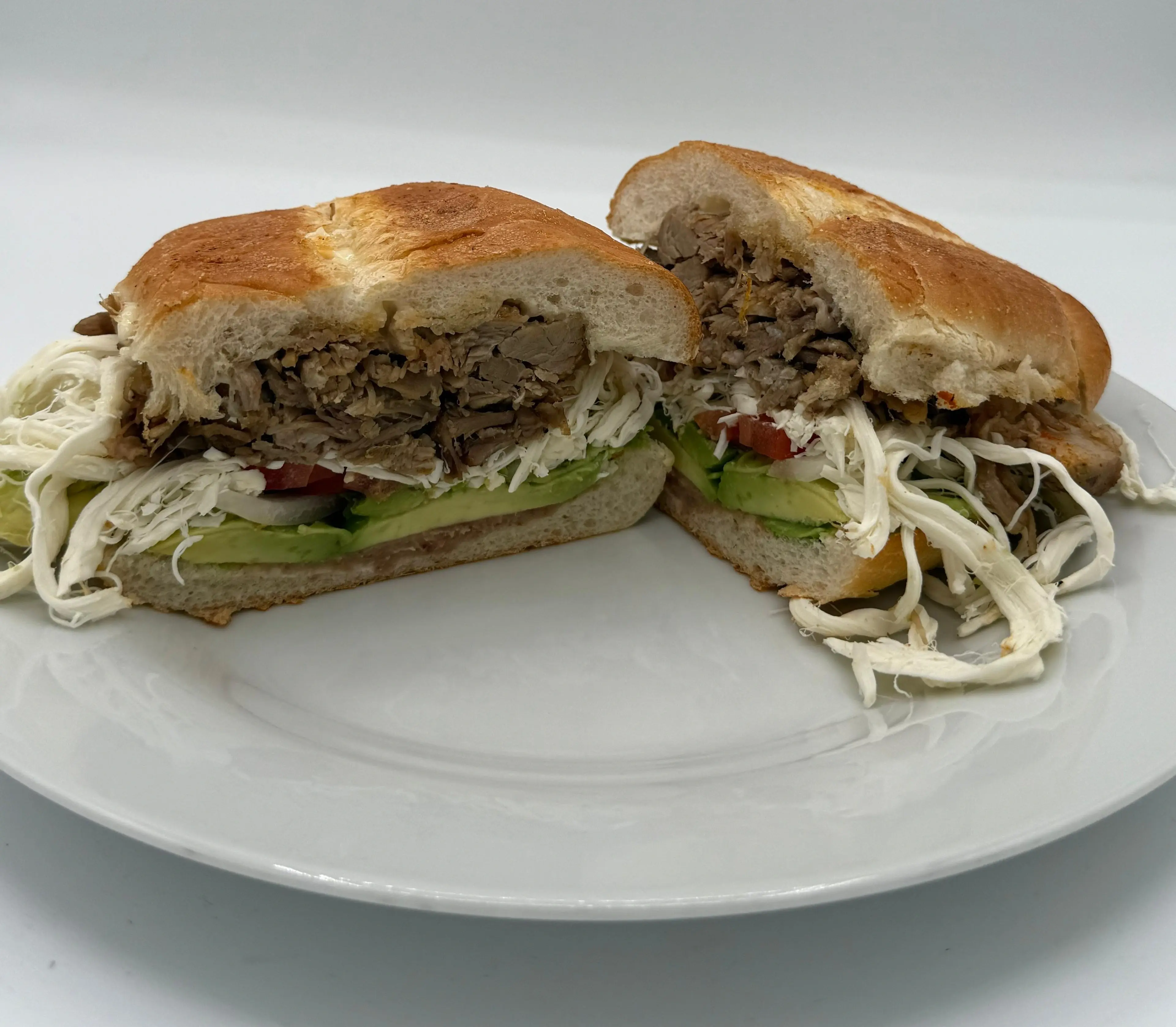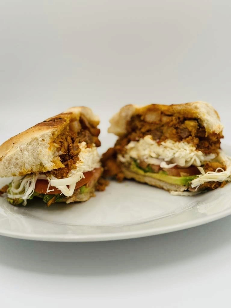 Slow-cooked, tender pork prepared with refried beans, cheese (quesillo), tomatoes, onions, avocado, mayonnaise, rajas or chipotle sauce (optional) on a toasted telera bread.