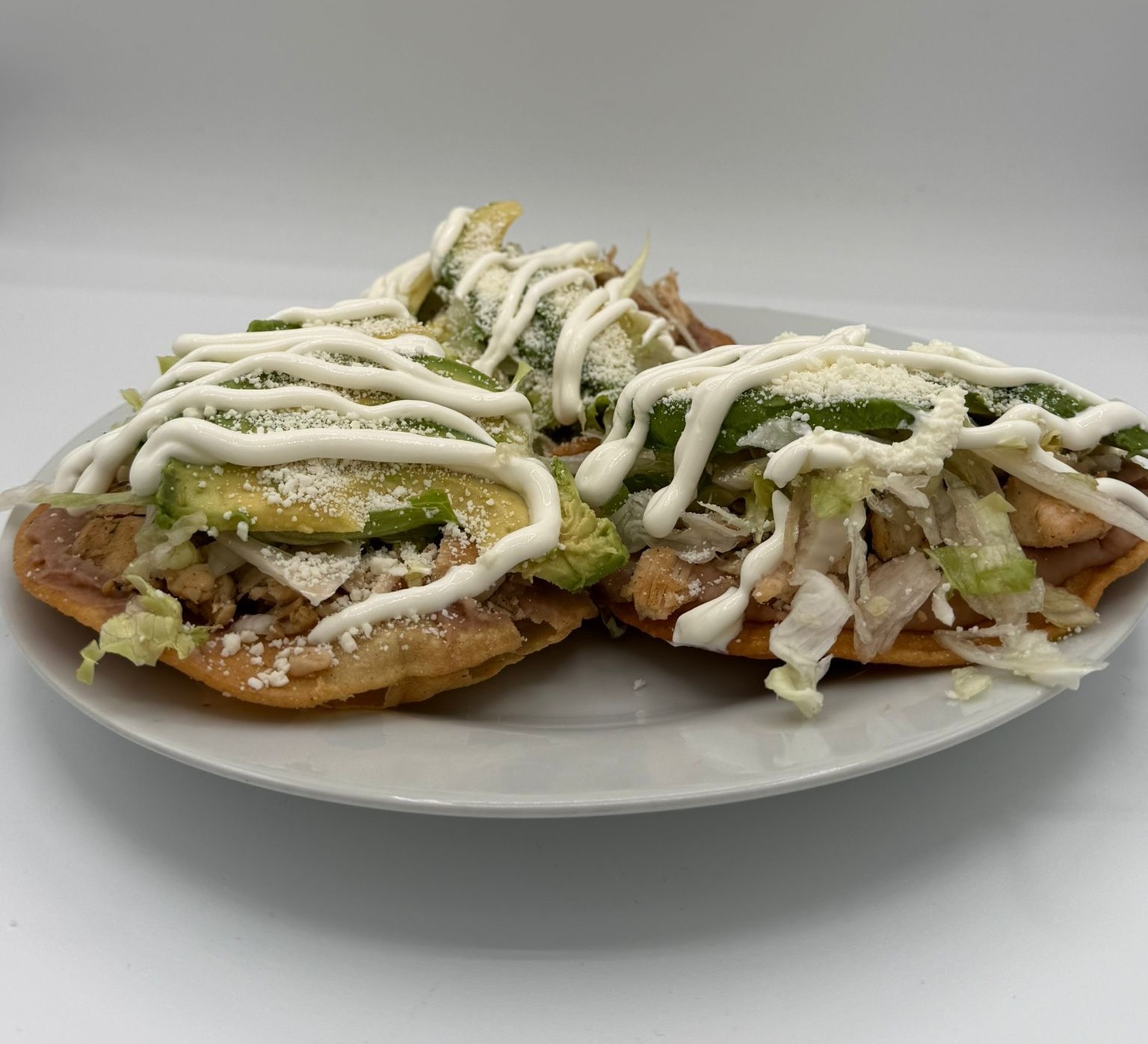 Topped with shredded lettuce, tomatoes, avocado slices, sour cream, valentina sauce, pork skin (cueritos) and cotija cheese.