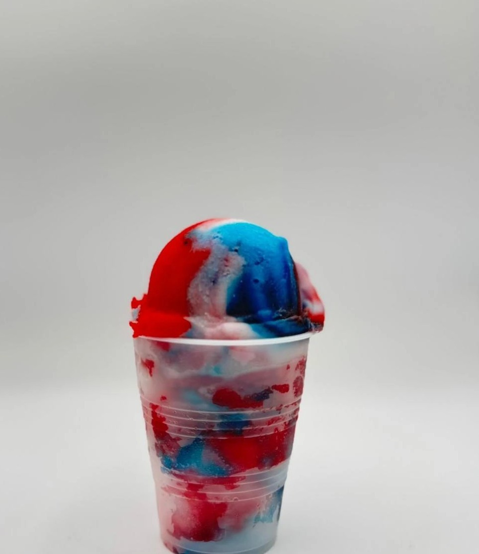 Mango Italian ice covered in chamoy sauce, Valentina sauce, tajin and slices of delicious fresh mango.