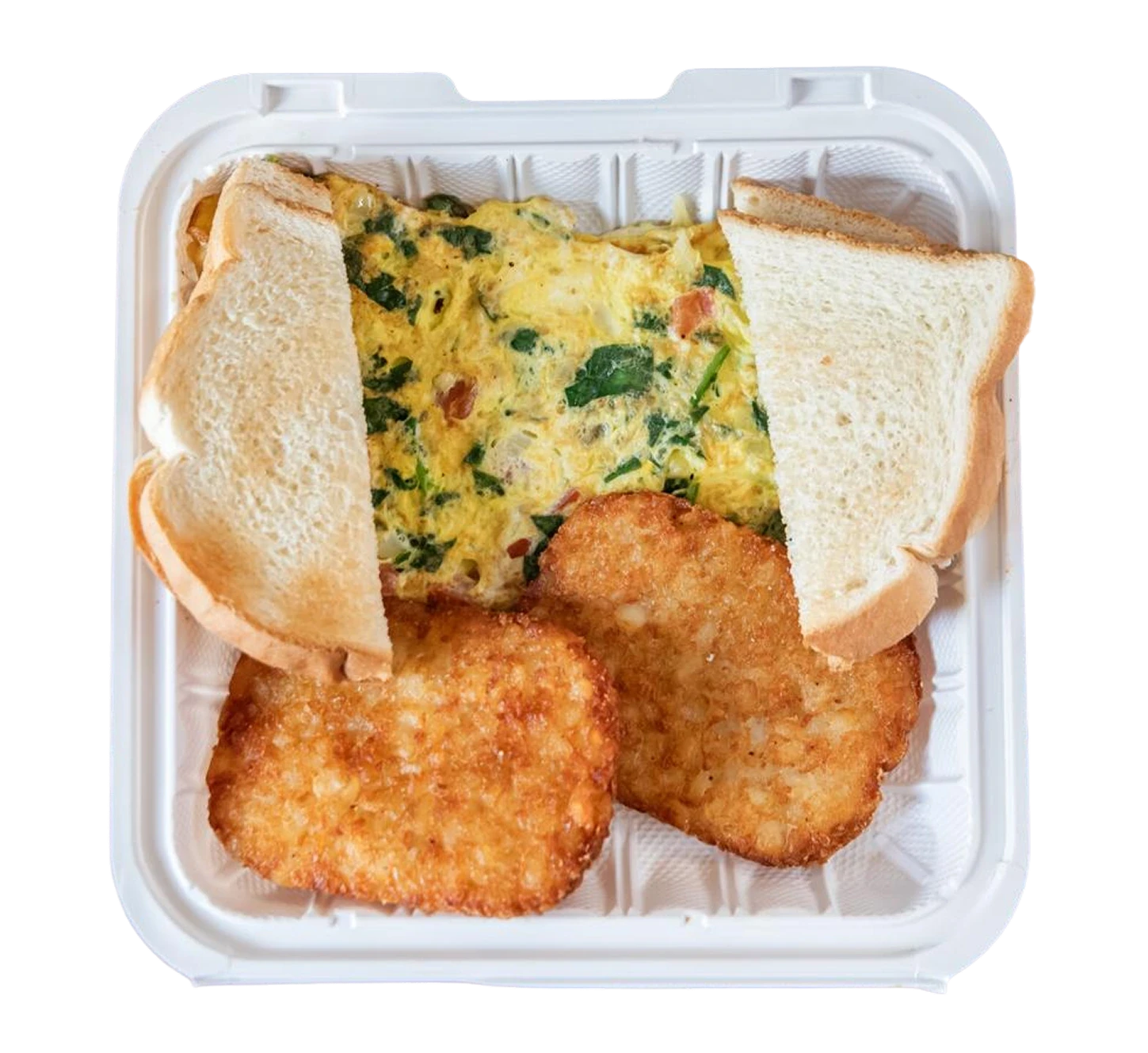 Comes with hashbrowns and white toast.