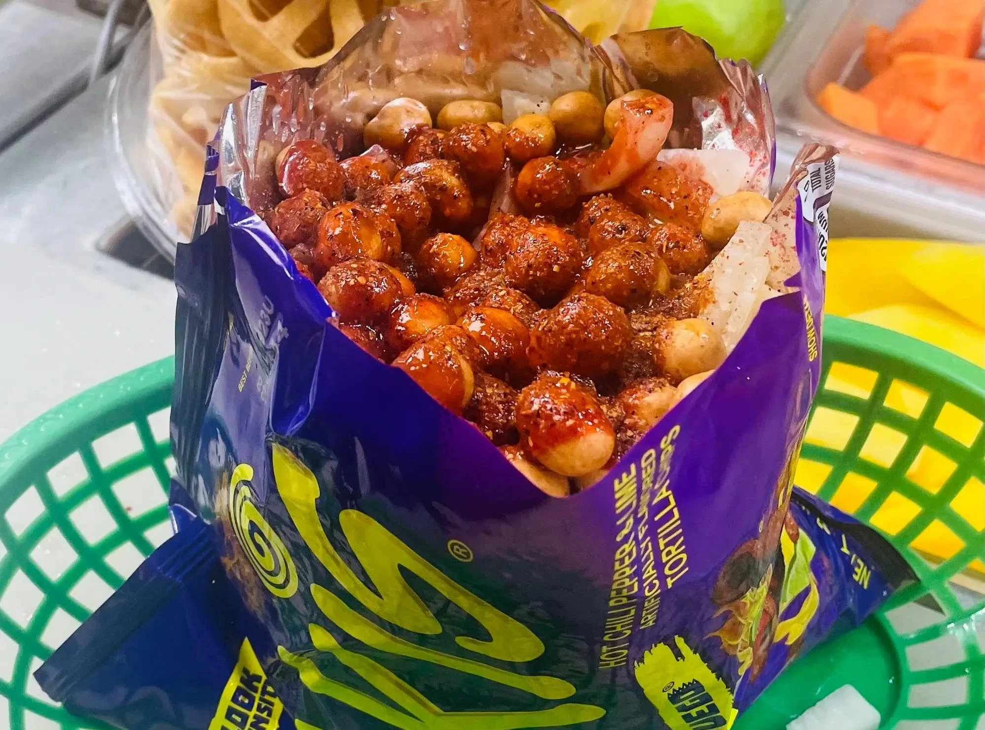 Doritos that come with cucumber, jicama, sheered carrots, pork skin, cacahuates, salt, lime, chamoy, Valentina and Tajín.