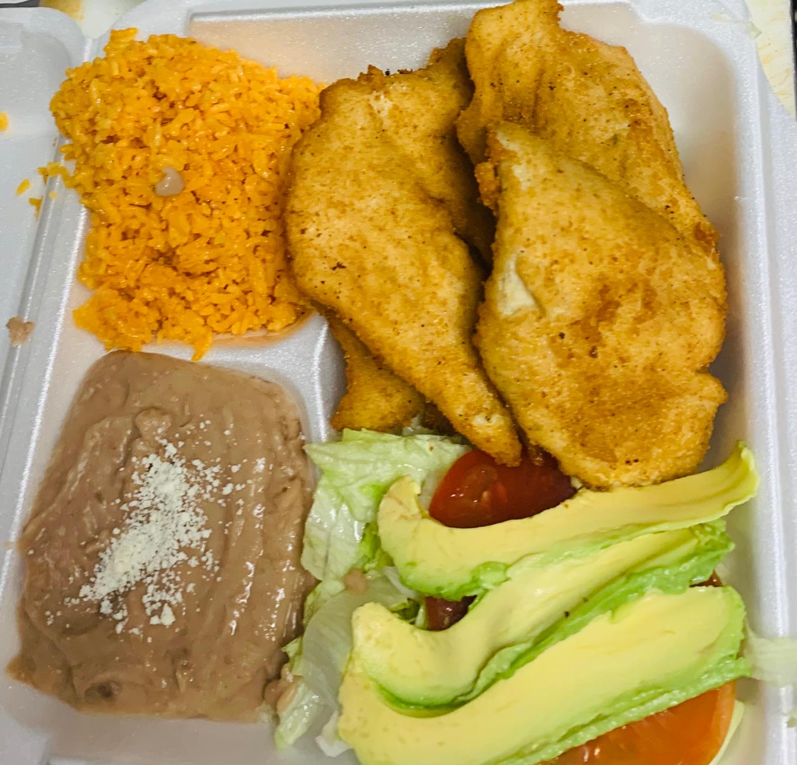 Breaded chicken prepared with refried beans, cheese (quesillo), tomatoes, onions, avocado, mayonnaise, rajas or chipotle sauce (optional) served on a toasted telera bread.