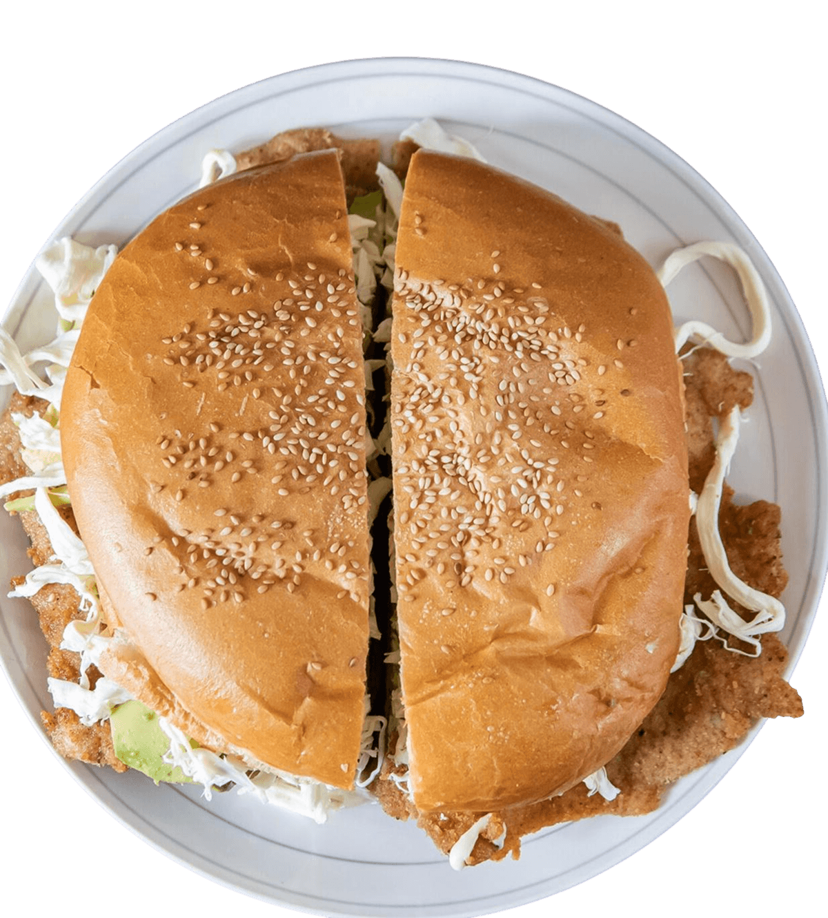 Breaded chicken prepared with refried beans, cheese (quesillo), tomatoes, onions, avocado, mayonnaise, rajas or chipotle sauce (optional) served on a toasted telera bread.