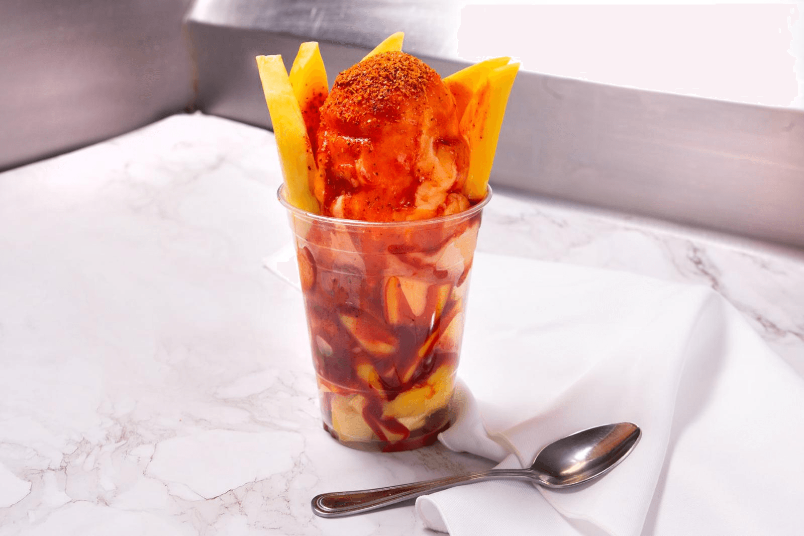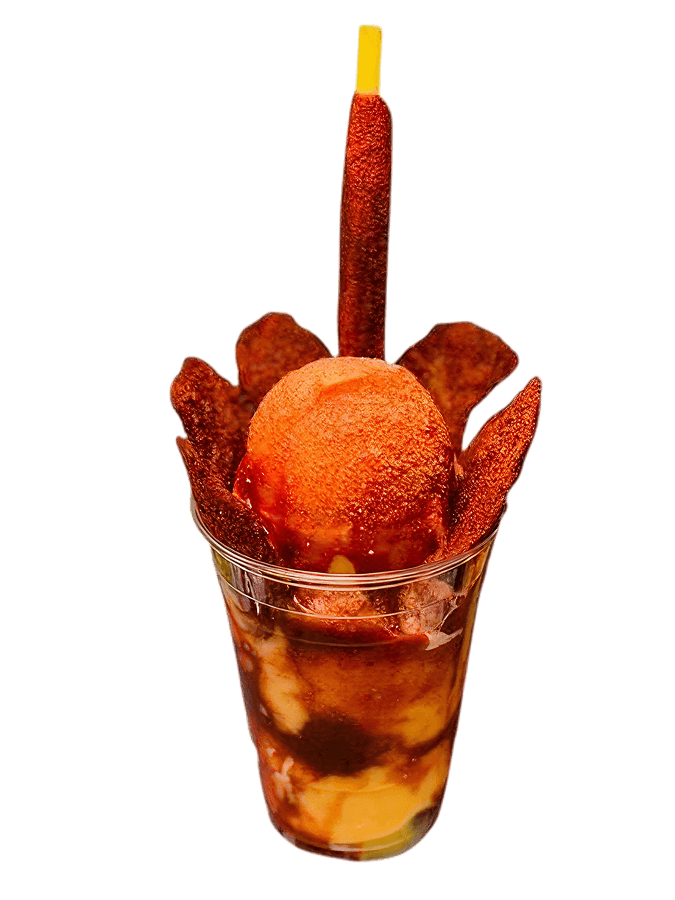 Mango ice blended with chamoy and tajin, mango chunks and tamarind candy for added texture and flavor.