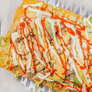 Topped with shredded lettuce, tomatoes, avocado slices, sour cream, valentina sauce, pork skin (cueritos) and with cotija cheese.