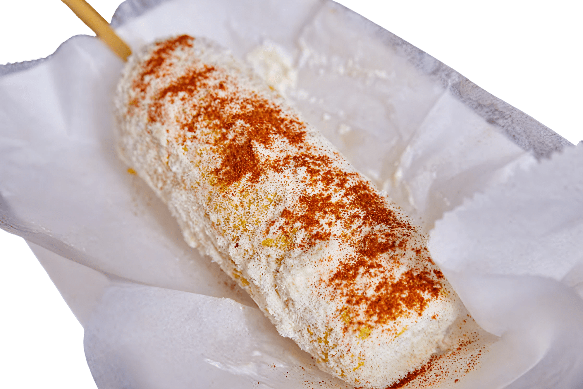 Corn on the cob coated with creamy mayonnaise, sprinkled with cotija cheese, and cayenne pepper powder.