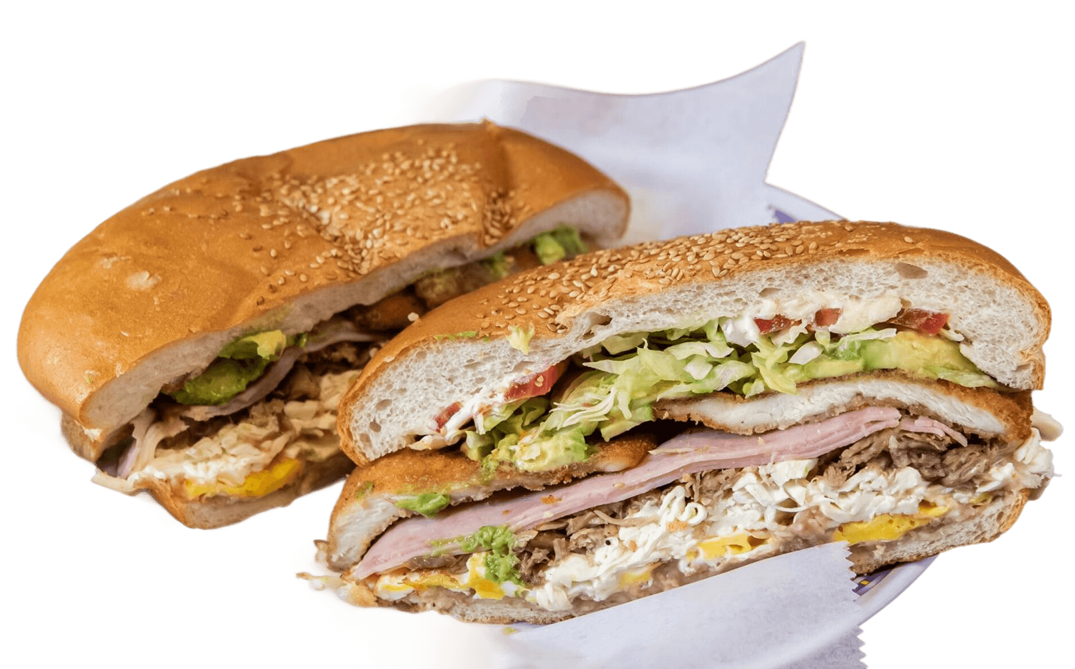 Fried egg, ham, carnitas and chicken. Prepared with refried beans, cheese (quesillo), tomatoes, onions, avocado, mayonnaise, rajas or chipotle sauce (optional) served on a toasted telera bread.