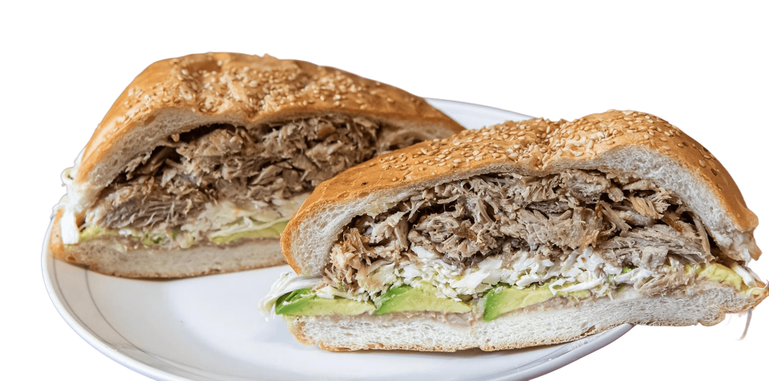 Slow-cooked, tender pork prepared with refried beans, cheese (quesillo), tomatoes, onions, avocado, mayonnaise, rajas or chipotle sauce (optional) on a toasted telera bread.