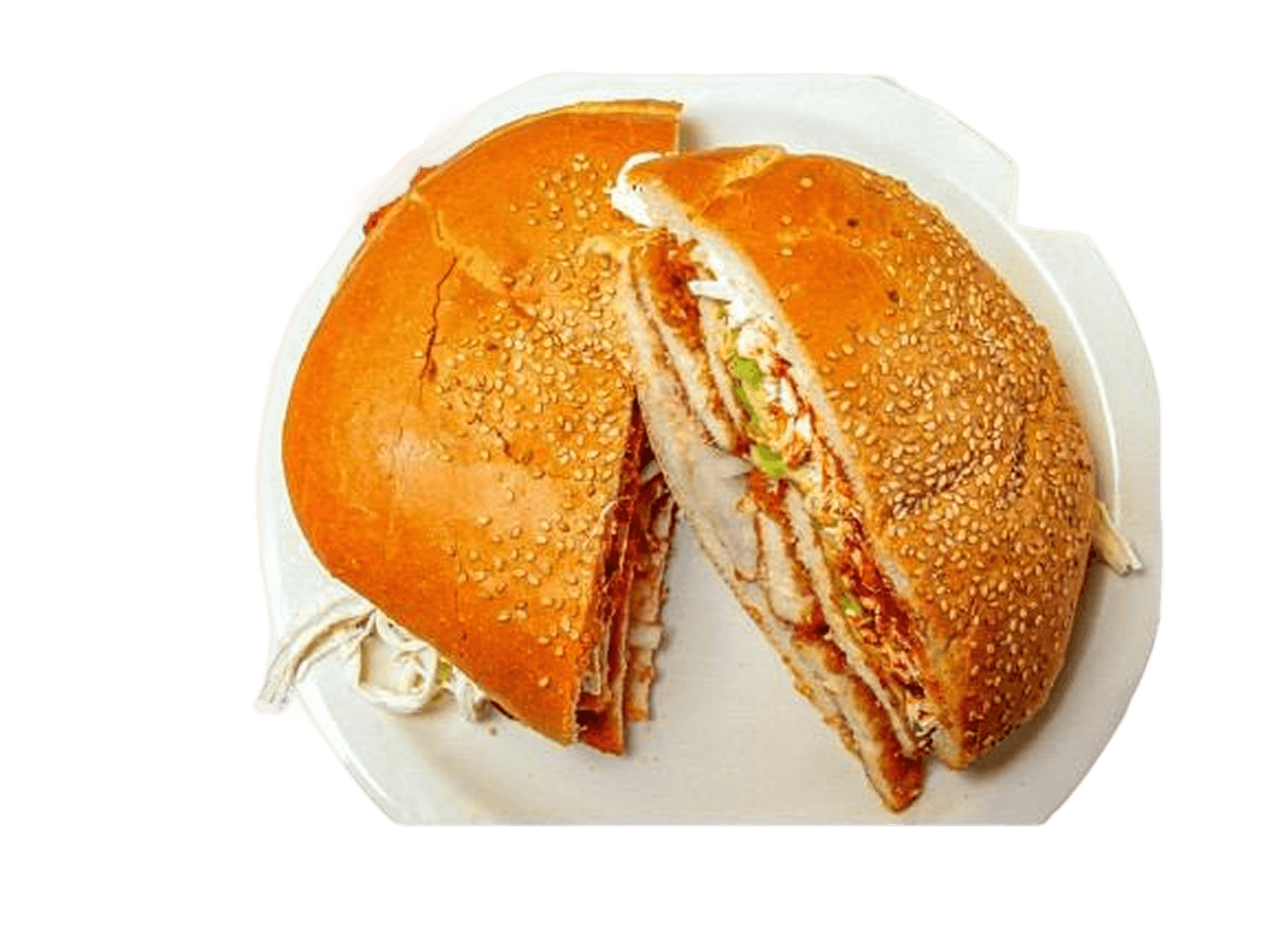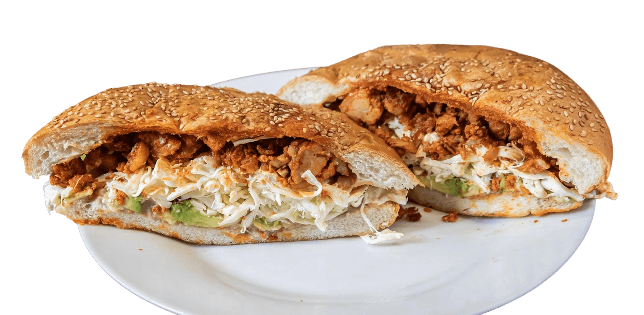Breaded chicken in a Puebla-style sandwich prepared with refried beans, onions, cheese (quesillo) avocado, mayonnaise and raja or chipotle (optional).