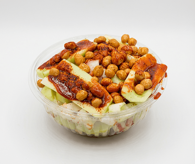 Cucumbers served with a combination of Valentina, chamoy, Tajín and peanuts.